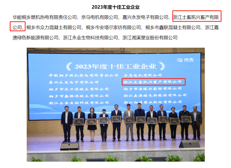 3月23日上午,洲泉鎮召開2024年經濟高質量發展工作推進會暨拼招商、攻項目、優環境動員部署會,充分肯定了浙江土畜凱興畜產有限公司(以下稱凱興畜產)過去一年穩健經營和創新發展成果,并授予凱興畜產洲泉鎮2023年度“十佳工業企業”和“優秀農業龍頭企業”雙重榮譽。
