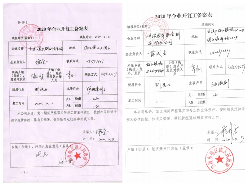 2月8日,省土畜下屬蘭溪墩頭制刷有限公司報備的19項防控措施獲得蘭溪市梅江鎮人民政府批準,成為當地首批正式啟動復工流程的企業。2月9日,省土畜下屬恩澤惠隆制刷有限公司的復工申請獲得蘭溪市梅江鎮人民政府批準。